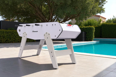 ¿Te tienta un futbolín de exterior? Los aficionados al futbolín pueden llevar su pasión al jardín con un futbolín de exterior diseñado específicamente para exteriores. ¿Tus hijos han invitado a sus amigos a pasar una tarde en el jardín? ¡Esta es la manera perfecta de que se lo pasen en grande! Pero los adultos también tienen su propio futbolín de exterior. Desde nivel intermedio hasta profesional, nuestros futbolines de exterior están disponibles en numerosas versiones para todos los perfiles de jugador. ¡Futbolines de exterior que lo resisten todo! La lluvia, los rayos UV y los insectos no dañarán la resistencia de nuestros futbolines de exterior. Sus materiales ultrarresistentes les confieren una gran durabilidad incluso con mal tiempo. La extrema robustez de su estructura, su madera tratada contra la humedad, su pintura resistente a los rayos UV, sus barras de acero de alta resistencia con garantía anticorrosiva y, por último, sus jugadores de plástico indestructible garantizan una durabilidad impecable. ¡Podrías montar tu futbolín de exterior en medio del bosque para disfrutar de la naturaleza durante tus entrenamientos! Que un futbolín de exterior esté diseñado para resistir cualquier condición climática no significa que no deba cuidarlo. Simplemente recuerde cubrirlo con su funda protectora. En invierno, también se recomienda guardarlo en un lugar seco y oscuro. Limpiar los tornillos y pernos con un producto de limpieza específico ayudará a preservar su color e impermeabilidad. Los futbolines de exterior fueron diseñados para la naturaleza y, por lo tanto, son perfectos para espacios al aire libre. ¡Centros recreativos, campings y otros centros deportivos no tienen que dudarlo ni un segundo!