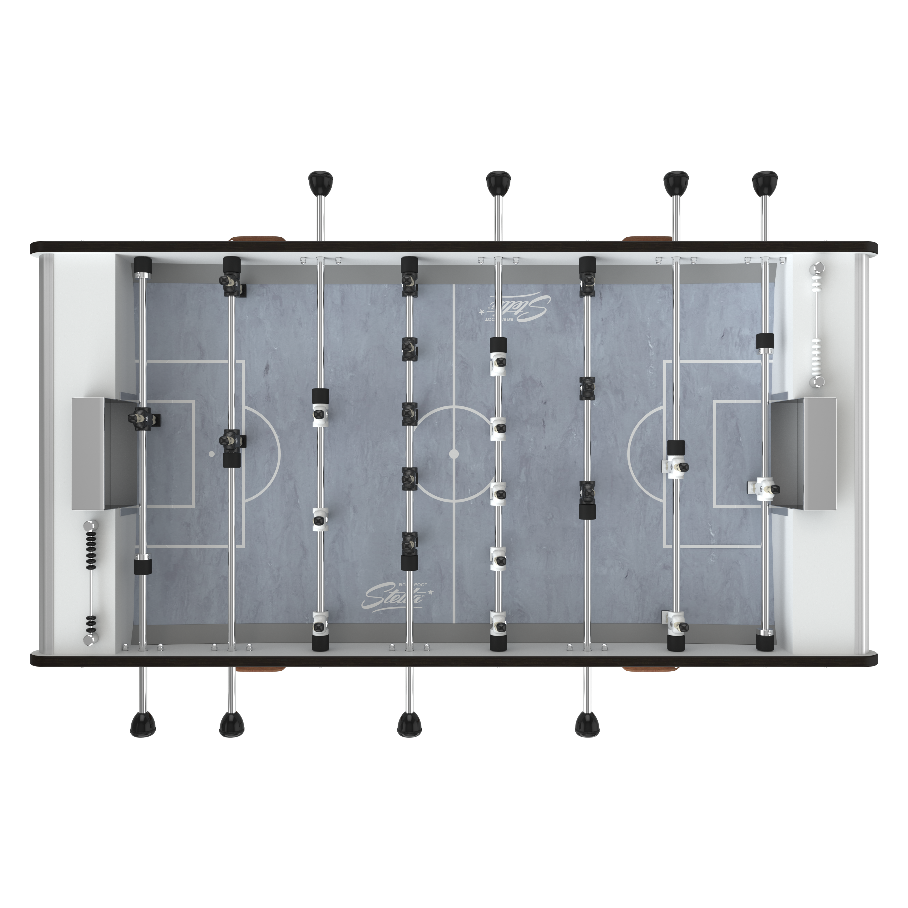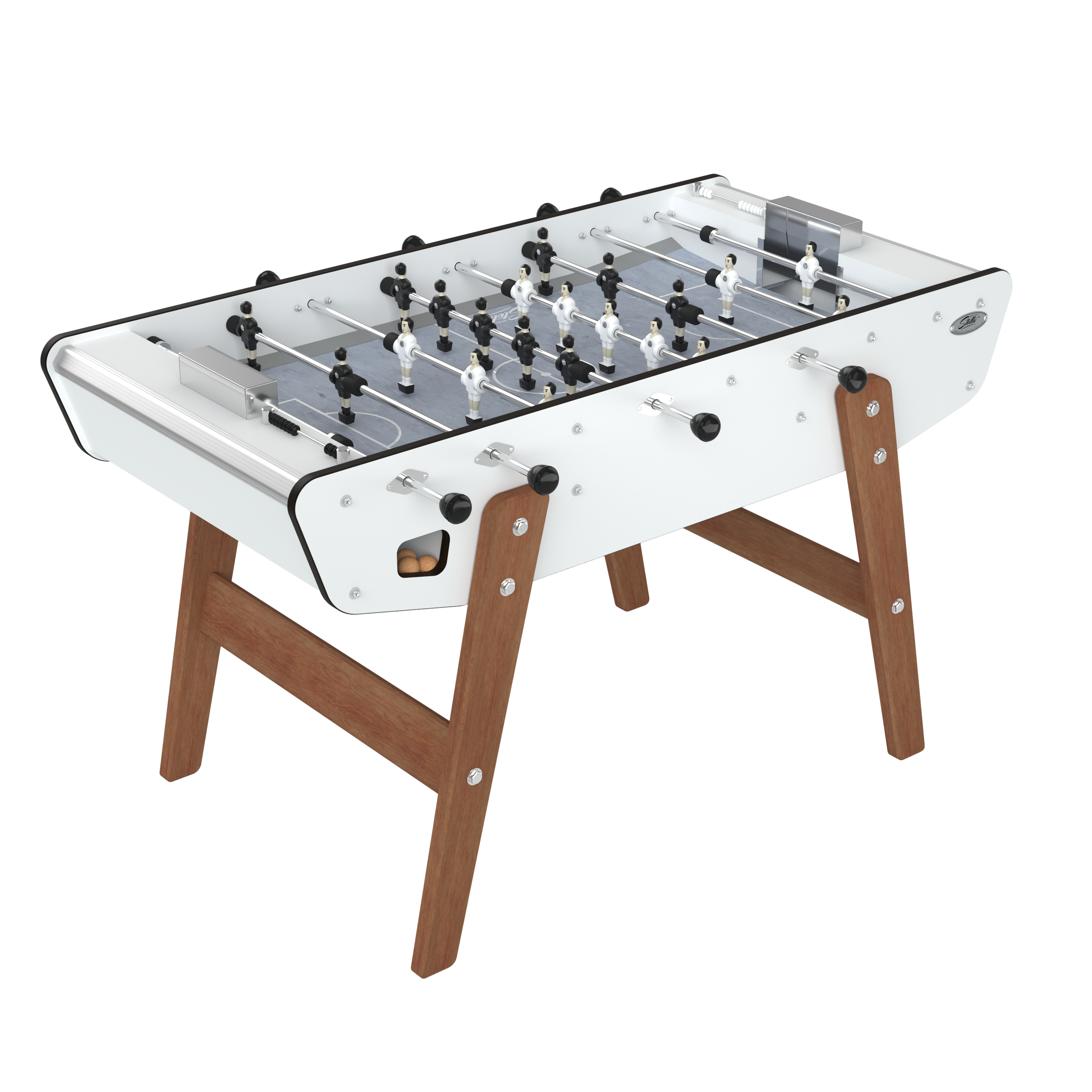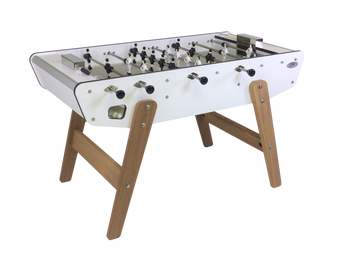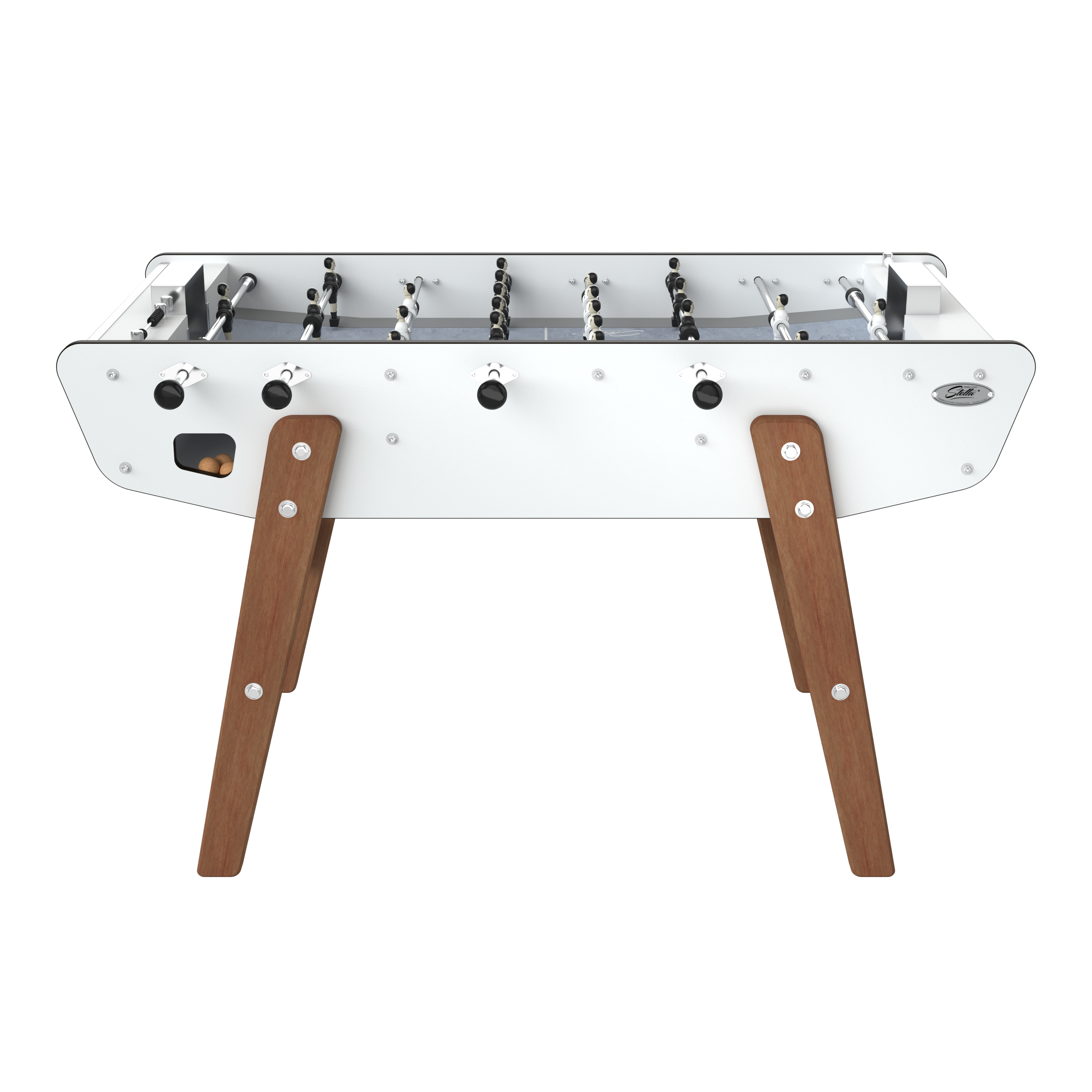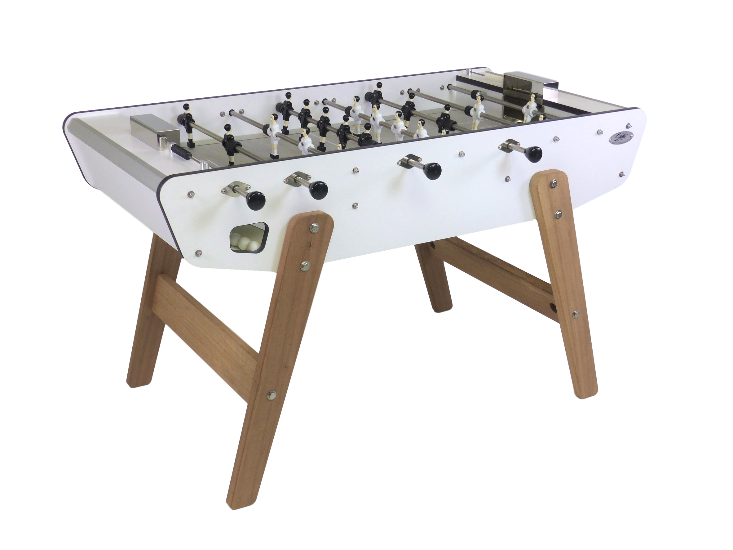 Su cuerpo laminado está reforzado con varillas de acero inoxidable y montado sobre patas de madera imputrescibles. Su superficie de juego de vinilo asegura un buen deslizamiento para un juego rápido y fluido. Y como la comodidad es importante incluso al aire libre, el futbolín Stella Outdoor ha sido equipado con cojinetes con casquillos de poliamida autolubricantes.