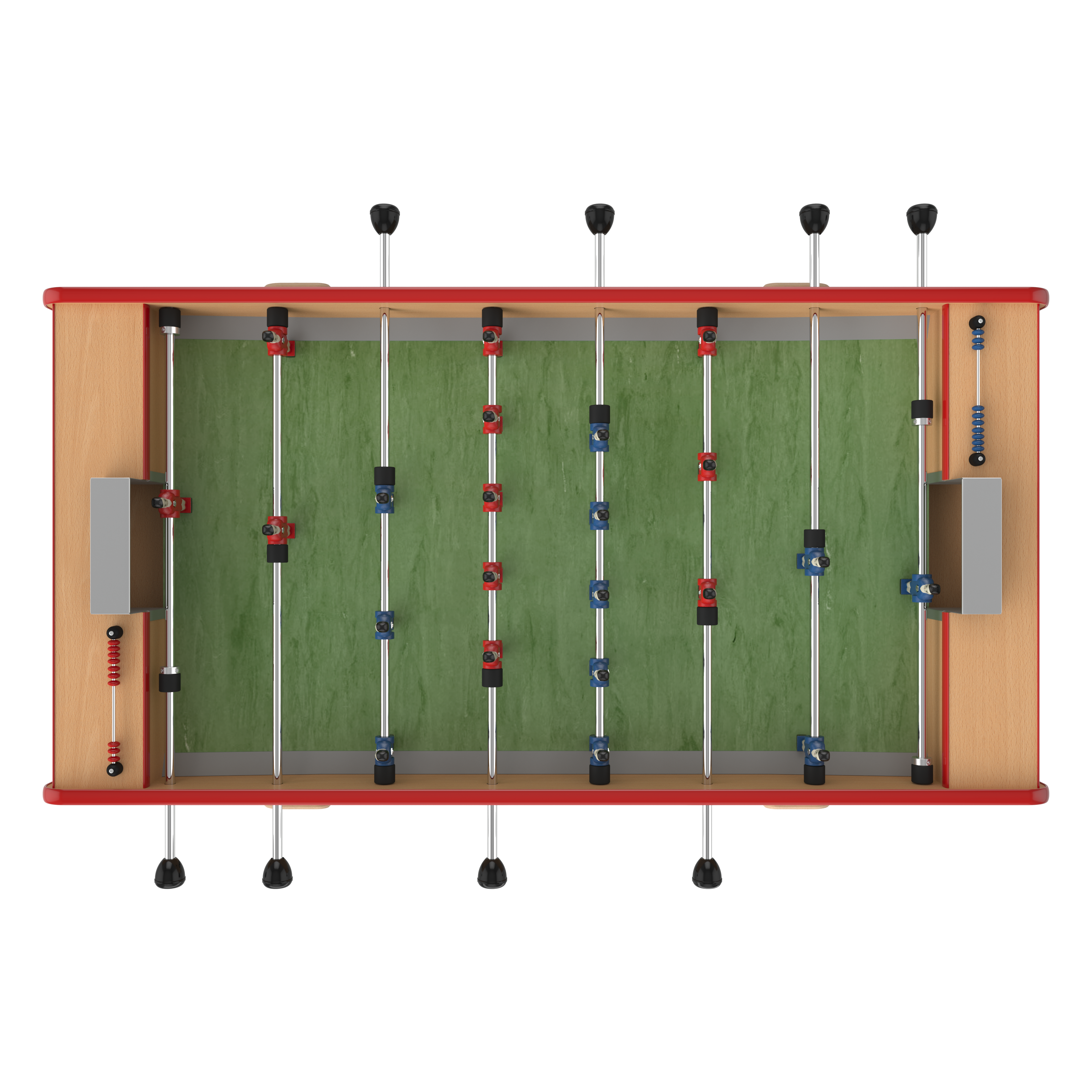 Estético y robusto, este futbolín de 150 x 100 x 93 cm incluye una caja de color haya maciza y patas de MDF rojo, barras telescópicas de acero cromado y jugadores de aluminio rojo y azul atornillados a las barras. ¡Un auténtico futbolín para sala de juegos!
