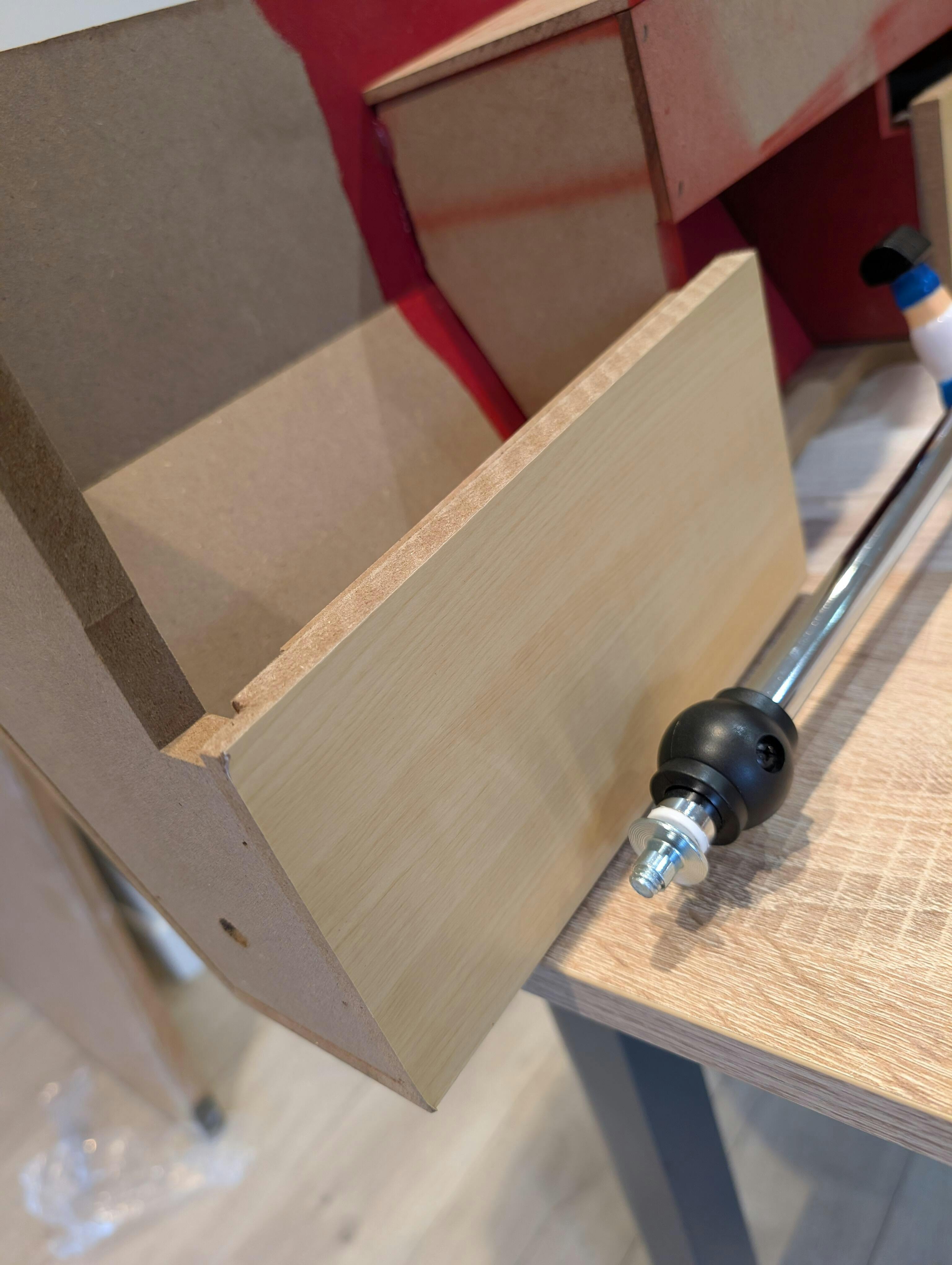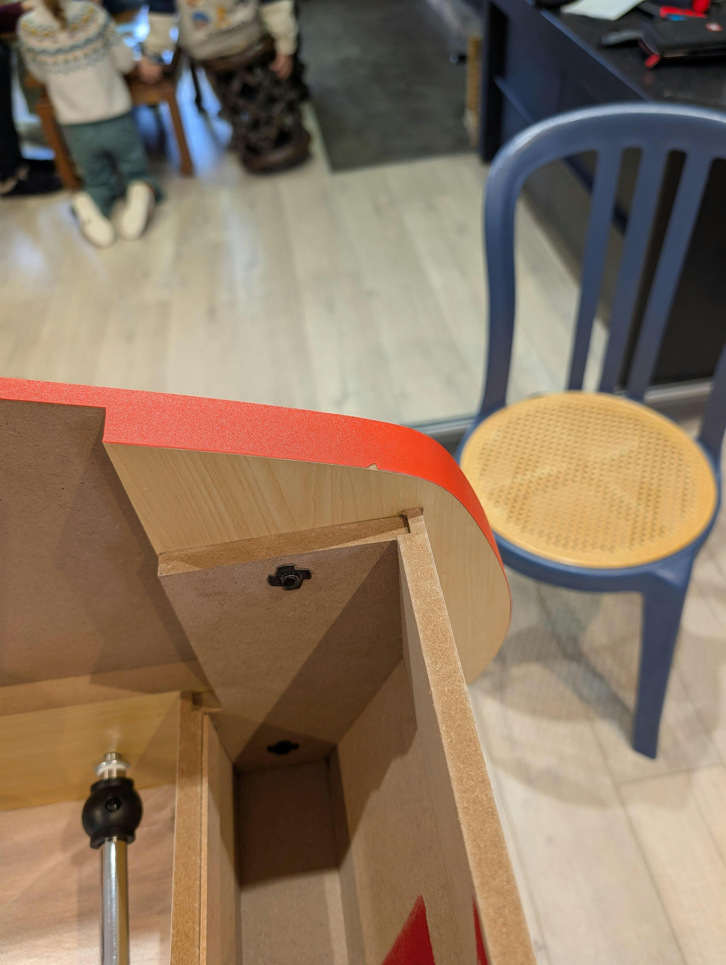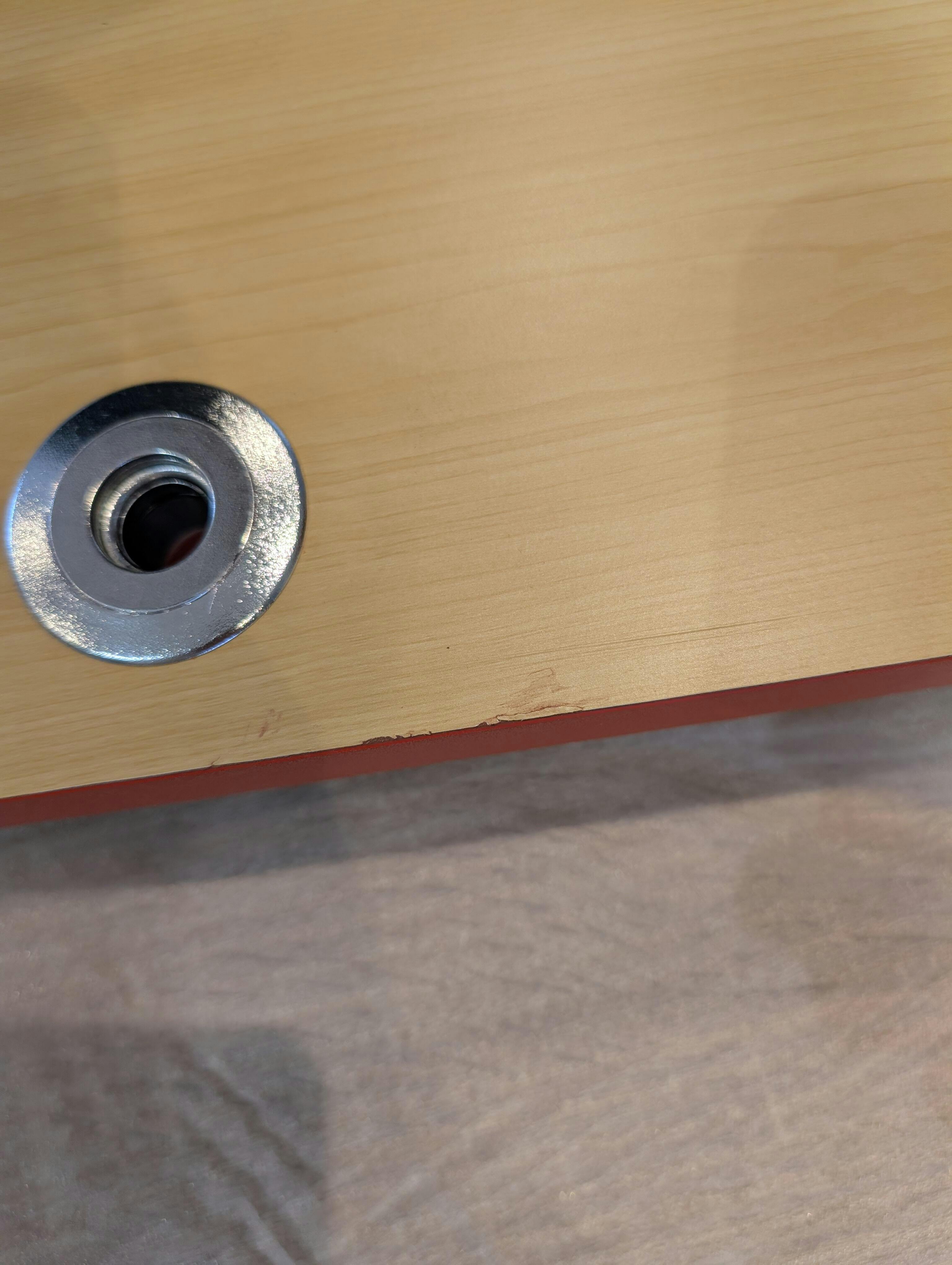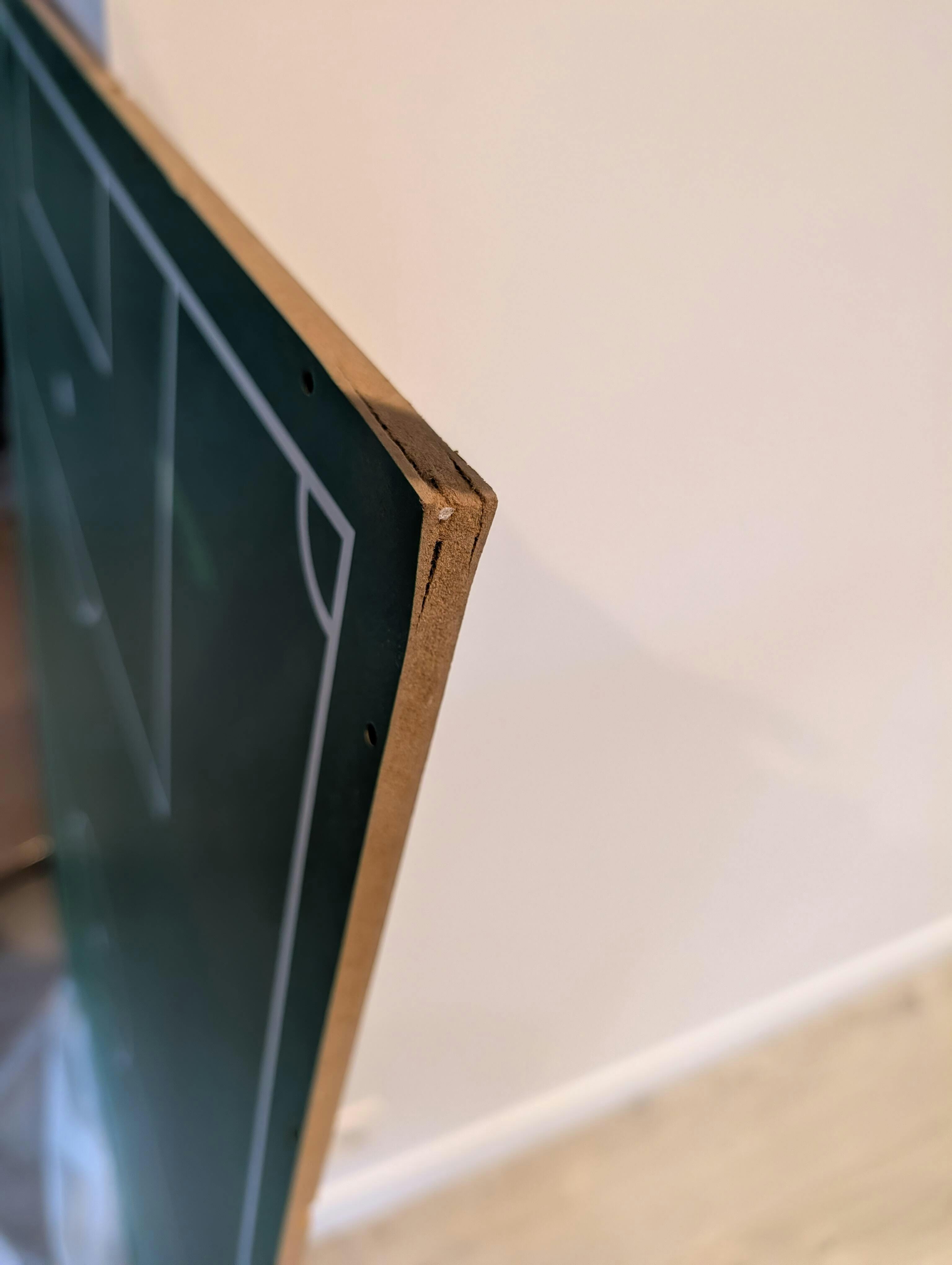 Le terrain est en bois recouvert d'une couche de mélaminé vert. Les coins sont relevés et le terrain est tracé pour retrouver le design d'un babyfoot de bar.