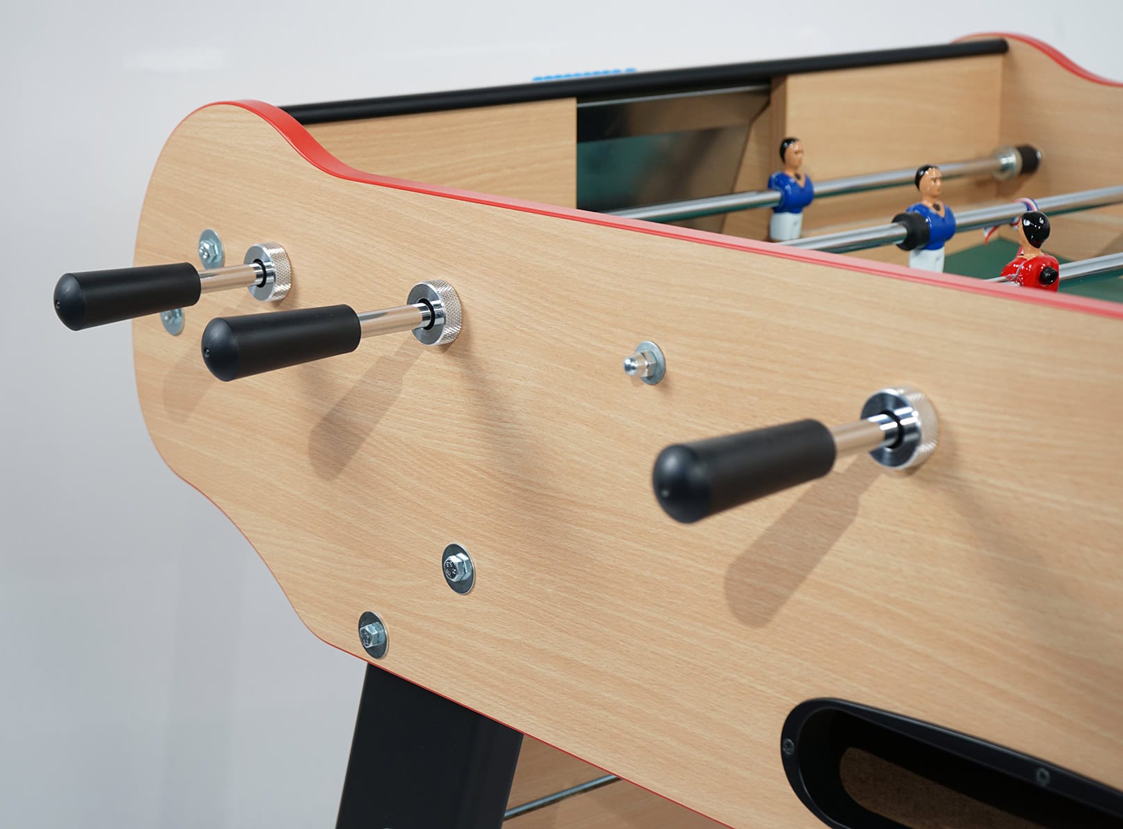El campo verde Gerflex ofrece una superficie de juego de alta calidad. Los jugadores de aluminio fundido, fijados sobre barras de acero cromado y decorados con camisetas rojas o azules y pantalones cortos blancos, se benefician de un sistema de fijación tradicional (tornillo que conecta la espalda a la garganta) que garantiza un control óptimo. Las barras, disponibles con mangos largos o redondos, garantizan un manejo preciso, mientras que las placas de acero inoxidable en la parte inferior de las jaulas producen el famoso sonido "BONG" durante los golpes potentes.